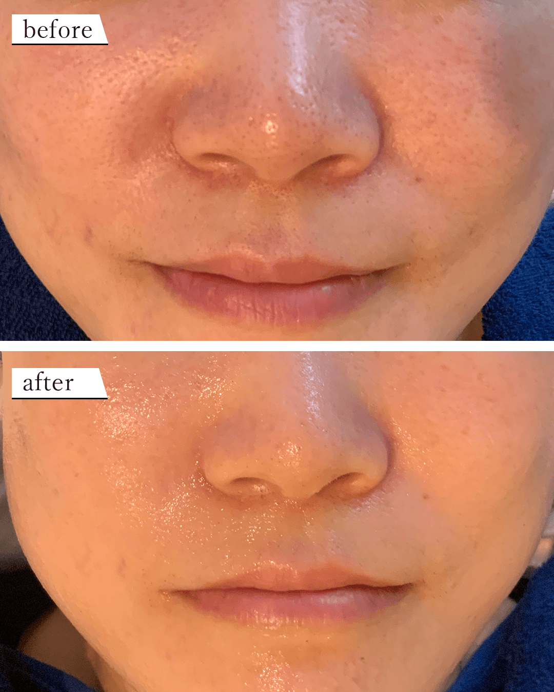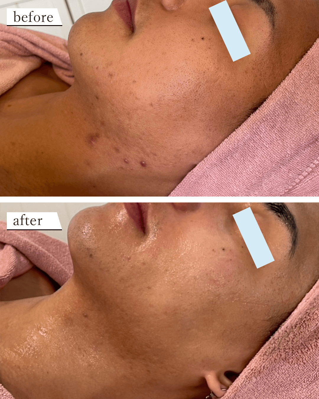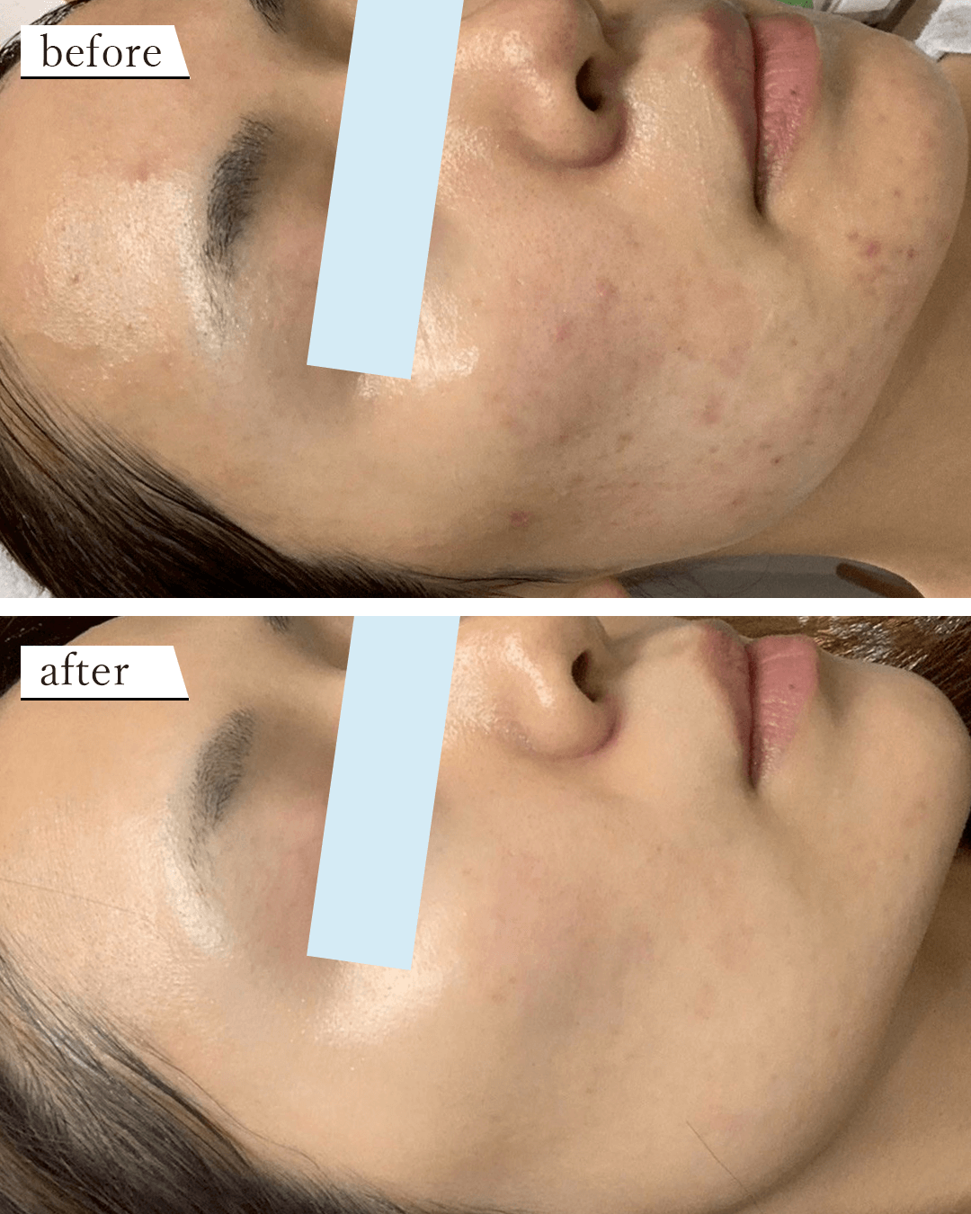 顎から首にかけての繰り返すニキビと、お顔全体の毛穴に悩まれていましたが、ホームケアもMELAME(メラミー)のクレンジング、ウォッシュ、エッセンス、ゲルマスクを使用していただき、プラチナクレイピール施術1回目でニキビが枯れ、2回3回と繰り返すうちに肌にツヤが増し、毛穴も目立ちにくくなり、肌質改善の効果を実感されました。