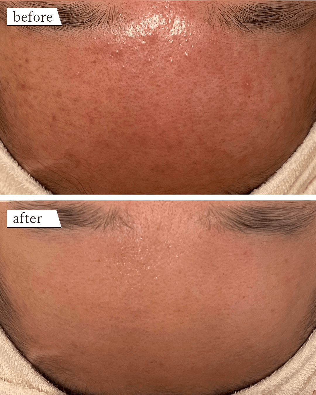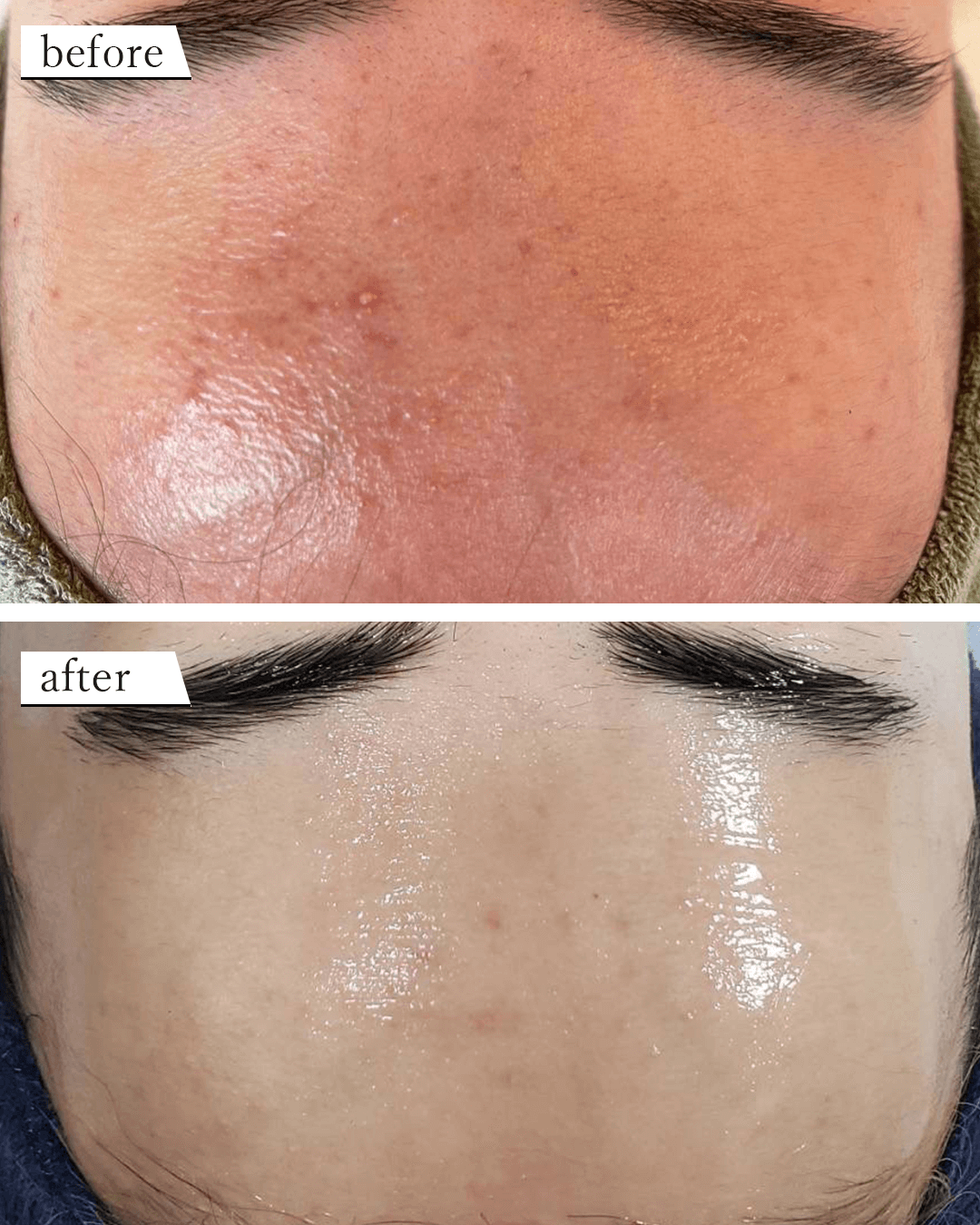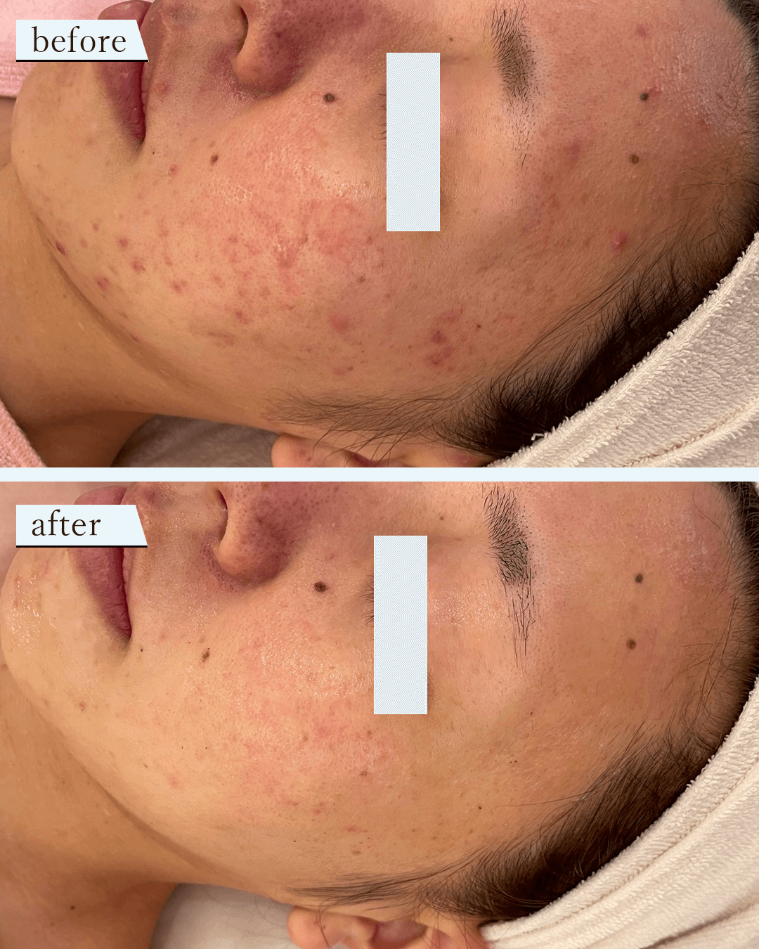 額のしつこいニキビと赤みを気にされていていました。プラチナクレイピールを月1回ペースで3回、施術を重ねる毎にみるみる理想の健康な素肌を取り戻していきました。ホームケアではMELAME(メラミー)スキンケアのラインナップを全て使用していただき、回数を重ねる度に赤みもニキビも改善し、満足のいく結果を実感されています。